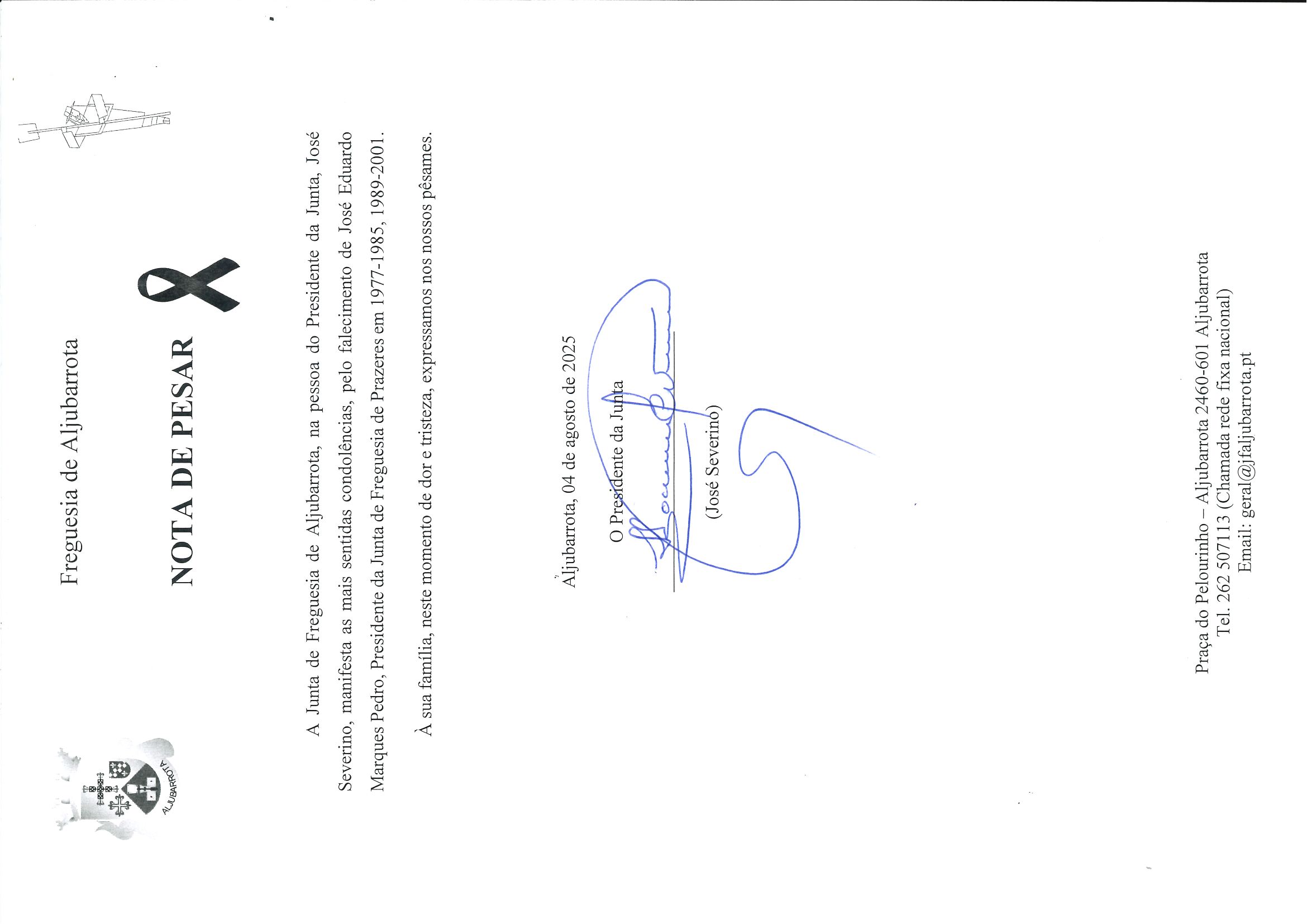 A Junta de Freguesia de Aljubarrota, na pessoa do Presidente da Junta, José Severino, manifesta as mais sentidas condolências, pelo falecimento de José Eduardo Marques Pedro, Presidente da Junta de Freguesia de Prazeres em 1977-1985, 1989-2001.