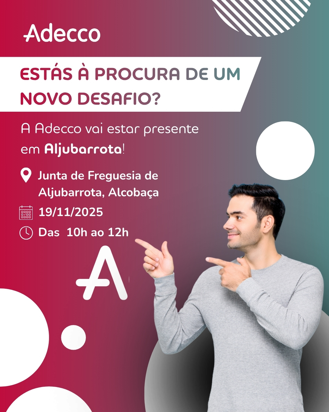A Adecco (empresa de trabalho temporário) vai estar presente em Aljubarrota no próximo dia 19/11/2025 das 10h às 12h.